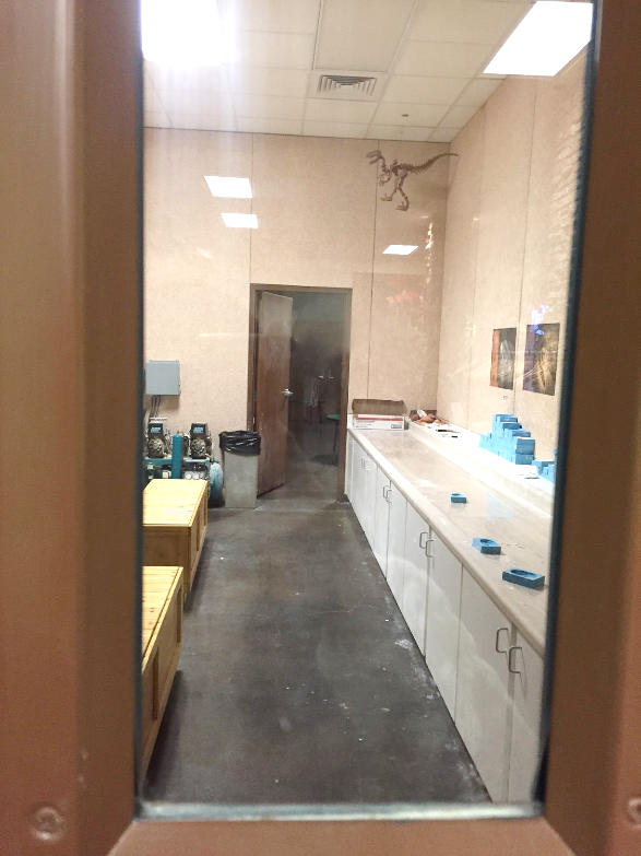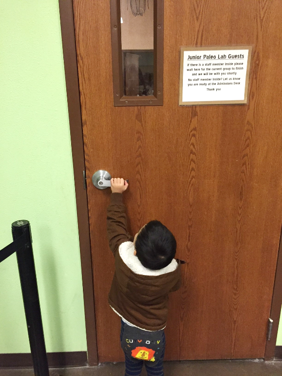 As we entered the museum and were walking to the entrance, there was a locked door called the “Junior Paleo Lab”. Being a curious and inquisitive boy that 2 yr. old kids are, he tried to open the door but wasn’t able to open it because it was locked. He couldn’t see what was inside, and he was too short to even know there was a little window that you could see through. But I could see through the window and saw what it was. I lifted him up and he was able to look at what was inside, and satisfied and his curiosity met, he ran away to explore somewhere else.