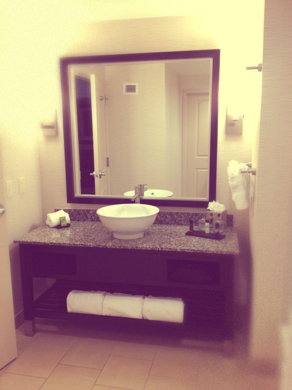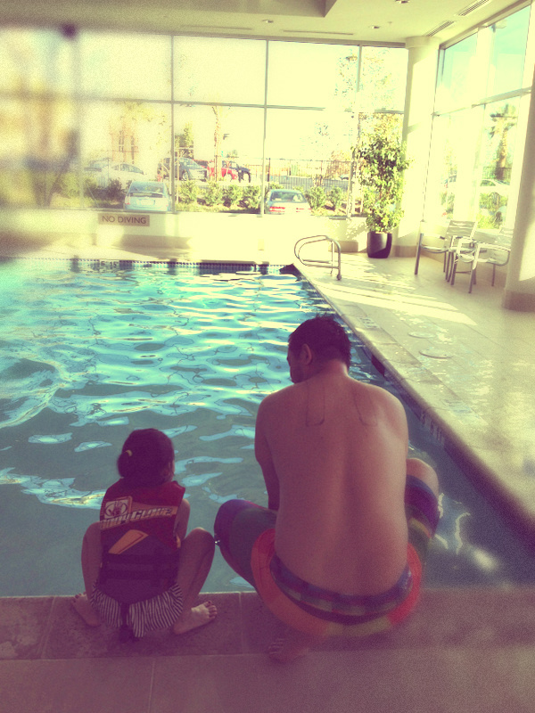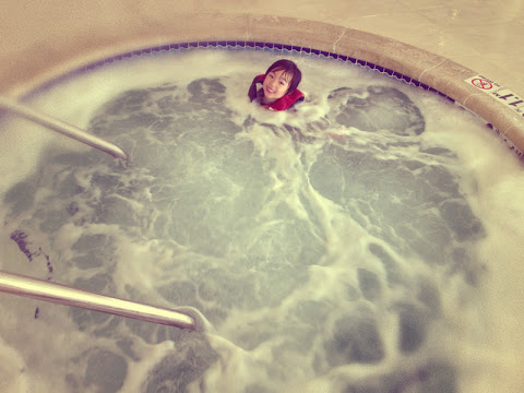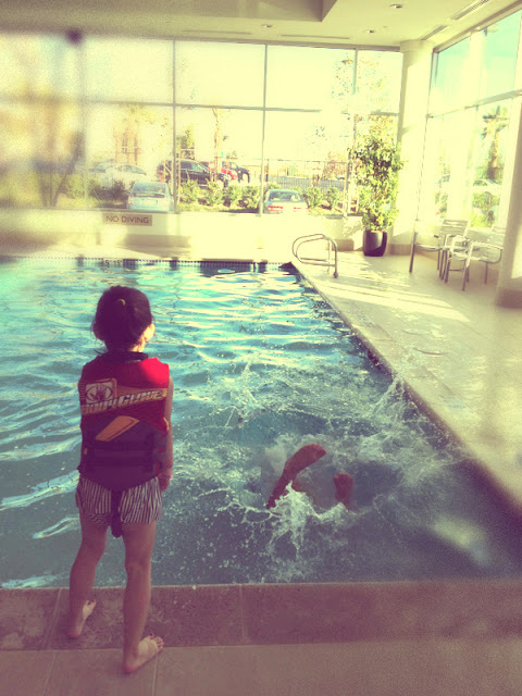 We stayed at the Embassy Suites Hotel in Ontario and one of the reasons we were excited to stay at this hotel(besides their nice bathroom!) was that they had a heated pool and a hot tub. Or supposedly, until Ana just jumped in the pool without any fear, only to start crying and freaking out in the water because of how cold it was. So Jay jumped in to get her and I could tell just by his face that the water was COLD. Well, that was enough proof for me so I just dipped my feet in the hot tub(which was not heated bytheway, but slightly warmer than the pool-turns out their heating system was broken), while I watched them swim.