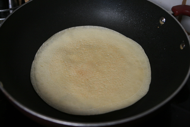 - Heat a lightly oiled griddle or frying pan over medium high heat. Pour or scoop the batter onto the griddle, using approximately 1/4 cup for each crepe. Tilt the pan with a circular motion so that the batter coats the surface evenly.