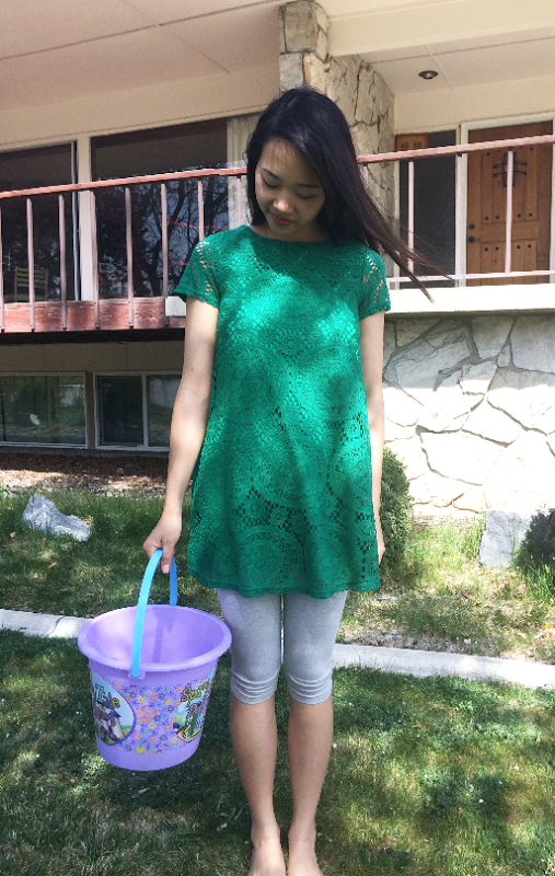 outfit detail: green lace tunic | leggings: ?(old)