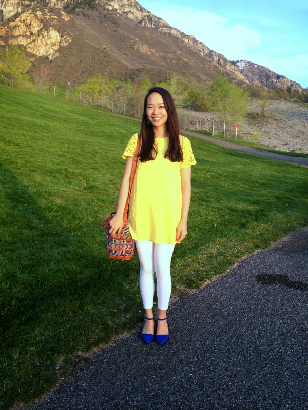 my outfit detail: yellow lace tunic | white pants | blue ankle straps | bag
