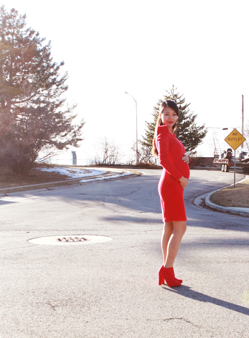 I have decided to post some maternity fashion series for the next little bit. I hardly buy any maternity clothes, and wear clothes in my closet that are not maternity clothes but can be worn as maternity wear. The red dress I’m wearing is stretchy so I can wear it with my 5 months bump. I probably won’t be able to wear it up until 9 months pregnant, but for now, it works! I also love the sharp, structured shoulders since it adds a different dimension to my body other than the round dimension I seem have all over my body. 🙂 The coat is also not maternity, but I was able to button it over my round belly without a problem. The waist-tie cinches right above my belly so it is figure flattering to the body.