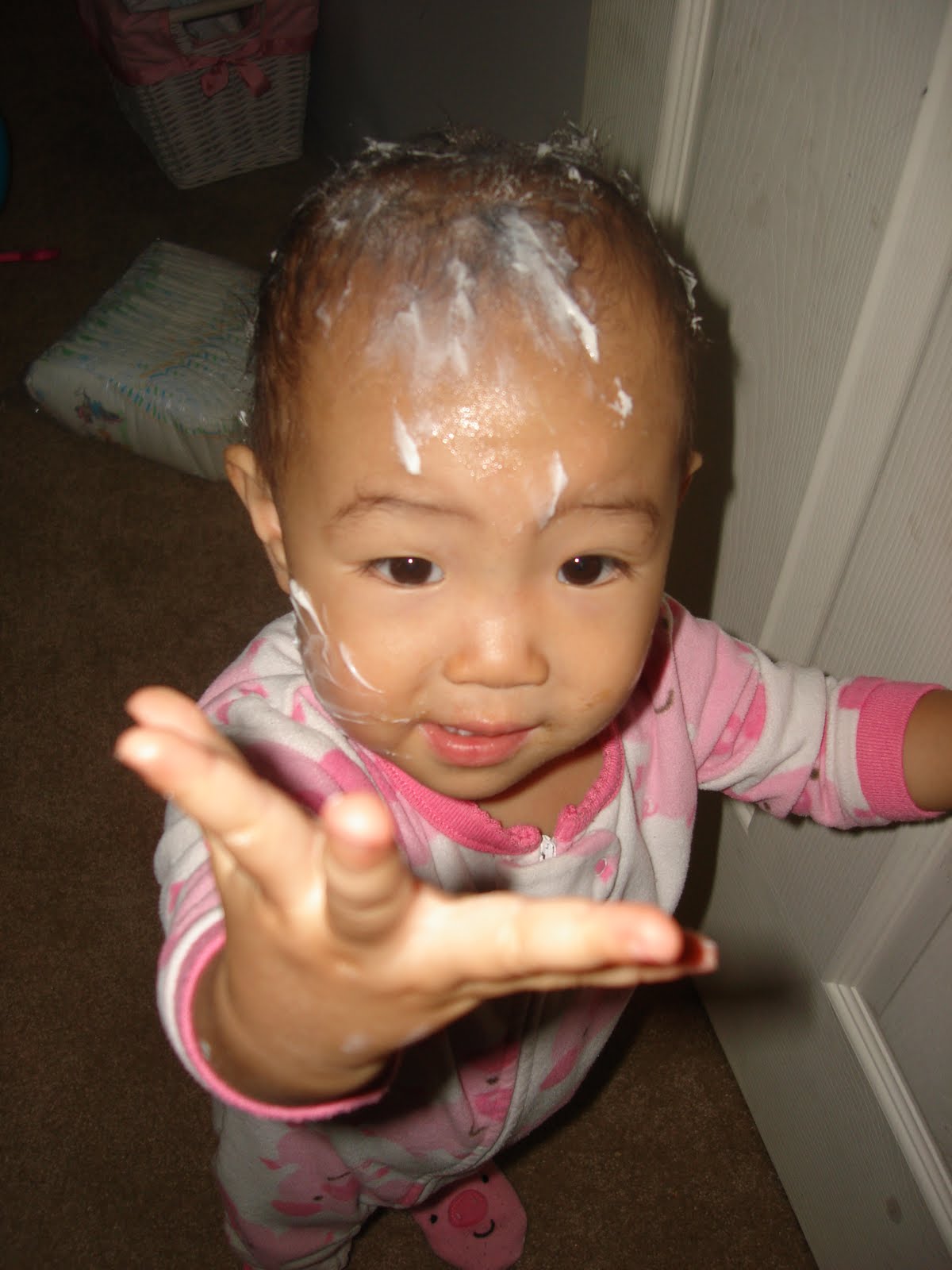 This is what happens when I leave them alone for 10 seconds. Adi put body cream all over Ana’s head.